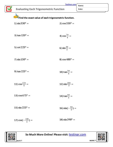 Evaluating Trig Functions Worksheets. Determine the values of the trigonometric. Bank on our printable evaluating function worksheets to equip high school students with a sound knowledge and practice in.