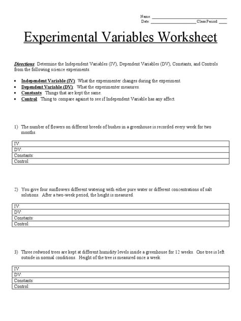Web experimental variables worksheet for the following experiments, define the (iv) independent variable, (dv) dependent variable, and (cg), control group. Worksheets are identifying variables work, identifying variables experimental design. Some of the worksheets for this concept are identifying variables work,.